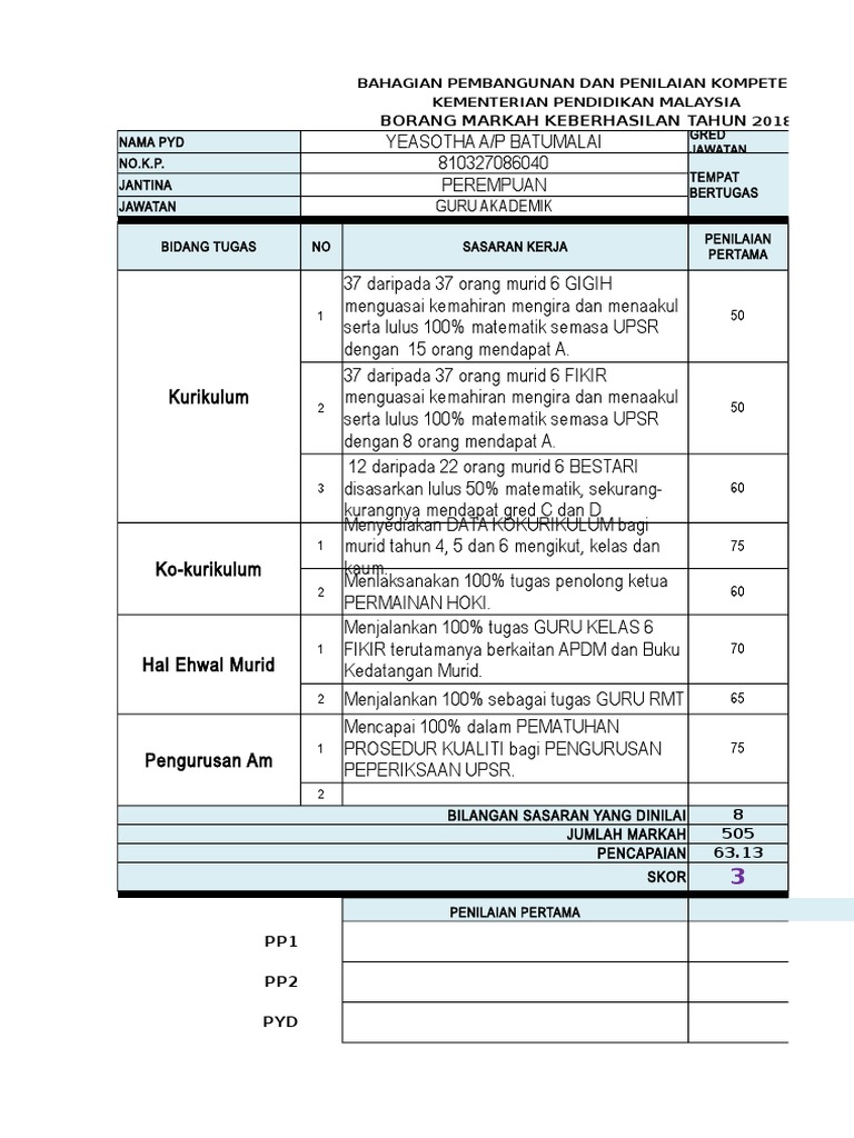 Contoh borang keberhasilan guru penolong akademik biasa terkini guru dan pegawai perkhidmatan pendidikan contoh borang keberhasilan. Aspek keberhasilan pengetua guru besar. Borang keberhasilan guru 2020 di malaysia jikalau dahulu kalangan guru di malaysia akan dinilai melalui sistem laporan nilaian prestasi tahunan lnpt. Moshims download borang keberhasilan guru 2019. Cara mengisi borang keberhasilan guru 2018. Excell ni masuk tapak blog jadi mcm ni. 98 % pengurusan panitia sains dapat dipertingkatkan bagi sesi 2016. Markah penilaian hendaklah diberi pada pertengahan tahun dan dimuktamadkan pada akhir tahun dalam tahun penilaian. Borang keberhasilan ini bolehlah dikatakan sebagai satu borang yang mengandungi kpi key performance index ataupun indeks penunjuk prestasi yang mahu namun begitu, masih ada ramai guru dan sekolah yang belum berjaya 100% menyediakan borang keberhasilan dengan setepatnya. Penilaian keberhasilan merupakan penilaian hasil kerja utama (outcome) yang memberi impak berdasarkan tugas dan tempat bertugas. Takpe yg penting cikgu yg akses dah biasa tapak excell dan copy paste je jika nak buat. Kt = 26, s=71 , ks = 74 dan skor guru ialah 4 kerana perbezaan s dan ks melebihi 3%. Asas penilaian keberhasilan berfokuskan kepada peningkatan atau pencapaian.