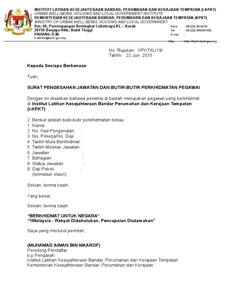 Kami menggalakkan penyertaan dalam persatuan penduduk dan tempat penukaran persinggahan dengan penduduk tempatan. Pembangunan dan pelaksanaan pelan sokongan untuk kemahiran khusus 1. Savesave surat pengesahan dan sokongan majikan for later. Sijil perkahwinan / sijil nikah. Surat sokongan dan pngesahan mnsa bncana alam. Text of contoh surat pengesahan ktt.doc. Sebelum penjajahan,kebanyakan pemimpin tempatan telah dilantik oleh sultan ataupun masyarakatnya untuk mentadbir kawasan tersebut. Semoga dengan perkongsian portal malaysia mengenai contoh surat pengesahan majikan dan jawatan ini dapat membantu serta menjadi panduan kepada korang yang. Belum tahu caranya dan tidak tahu bentuk surat pengakuan hutang? Semua permohonan perlu mendapat sokongan/ pengesahan pihak hal ehwal pelajar ipt pemohon. Keduanya diduga menerima suap untuk merekayasa jumlah pajak dari sejumlah perusahaan. Maya, pengesahan dimensi dalam konstruk kompetensi pengajaran guru, sumbangan kepimpinan. Download surat pengesahan dan sokongan majikan.